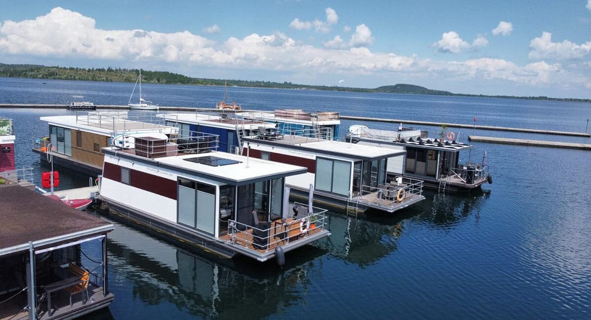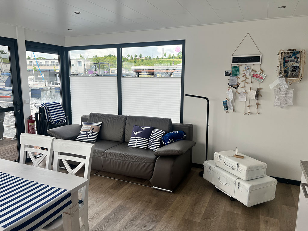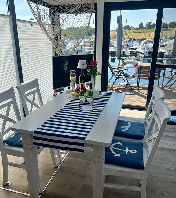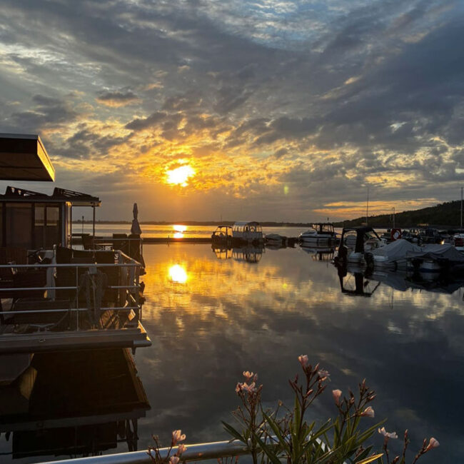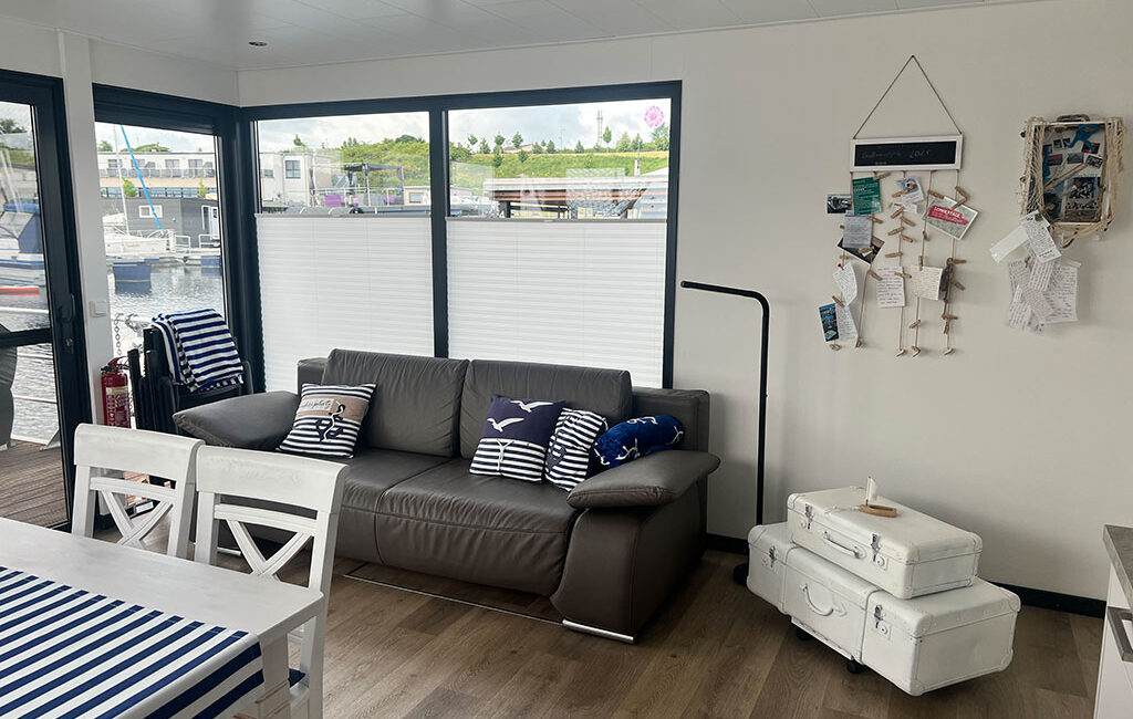 Ein ganz besonderes Urlaubserlebnis bietet ein Aufenthalt auf einem fest verankerten Hausboot direkt am Steg des Geiseltalsees. Das schwimmende Ferienhaus liegt ruhig im Wasser und ist über Versorgungsleitungen dauerhaft an Strom, Wasser und Abwasser angeschlossen – ideal für komfortbewusste Gäste, die das Flair des Sees genießen möchten, ohne auf Annehmlichkeiten verzichten zu müssen. Große Fensterfronten und eine großzügige Terrasse bieten einen herrlichen Blick über den See, während moderne Ausstattung im Inneren für gemütliche Stunden sorgt. So lässt sich der Tag mit einem Frühstück am Wasser beginnen und mit einem Glas regionalem Wein beim Sonnenuntergang ausklingen.