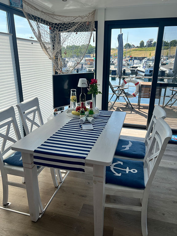 Erlebt Urlaub auf eine besondere Art: Unser fest verankertes Hausboot direkt am Geiseltalsee vereint maritimes Flair mit dem Komfort einer modernen Ferienwohnung. Freut euch sich auf ein gemütliches Schlafzimmer, ein modernes Bad, eine voll ausgestattete Küche und eine großzügige Terrasse mit direktem Seeblick.